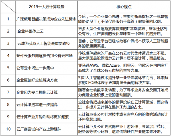 中國云計算經歷10年發展,已經廣泛服務于社會經濟。市場上,出現阿里云這樣躋身全球前三的云服務商。應用方面,城市大腦、智慧工廠、農業AI等項目頗為亮眼,為下一輪數字經濟的全面鋪開打下基礎。面向2019年,記者廣泛采訪了業內人士、分析師和企業決策層,對云計算產業新一年的發展趨勢作出十大預測。