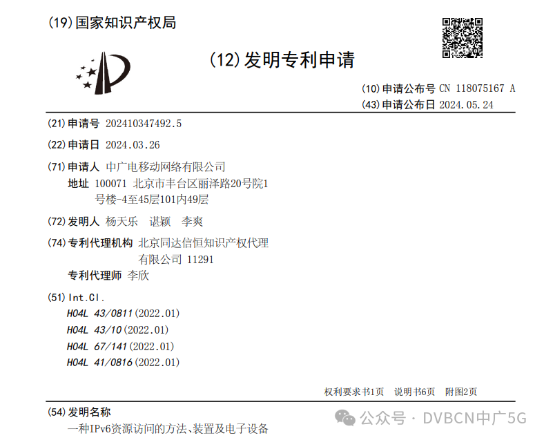 該專利名稱為——一種IPv6資源訪問的方法、裝置及電子設備,申請日為2024年3月26日,申請公布日為2024年5月24日,申請人為中廣電移動網絡有限公司,發明人包括楊天樂、諶穎、李爽。